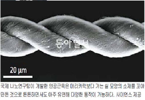 한양대 김선정 교수팀은 미국, 호주 등의 국제 나노연구틴과 함께 강하면서도 유연한 실모양의 인공근육을 개발했다고 15일 밝혔다. 지금까지 개발된 인공근육은 늘어나거나 줄어들 수 있어 굽히거나 펴는 동작은 할 수 있었지만 비틀거나 회전 운동을 하는데는 한계가 있었다.