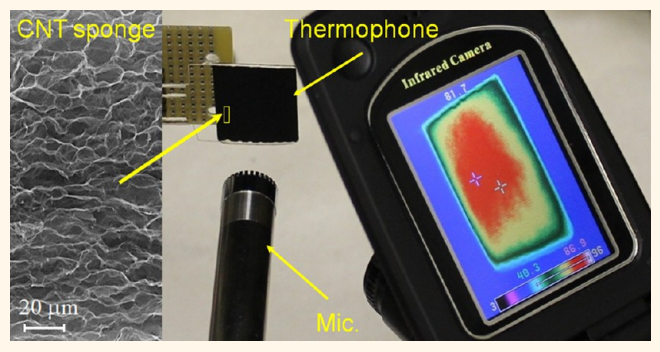 Thermophones are highly promising for such applications as high power sonar arrays, flexible loudspeakers, and noise cancellation devices. So far, freestanding carbon nanotube aerogel sheets provide the most attractive performance as a thermoacoustic heat source. However, the limited accessibility of large-size freestanding carbon nanotube aerogel sheets, and other even more exotic materials recently investigated, hampers the field. We here describe alternative materials for a thermoacoustic heat source with high energy conversion efficiency, additional functionalities, environmentally friendly and cost effective production technologies. We discuss the thermoacoustic performance of alternative nanostructured materials and compare their spectral and power dependencies of sound pressure in air. We demonstrate that the heat capacity of aerogel-like nanostructures can be extracted by a thorough analysis of the sound pressure spectra. The study presented here focuses on engineering thermal gradients in the vicinity of nanostructures and subsequent heat dissipation processes from the interior of encapsulated thermoacoustic projectors. Applications of thermoacoustic projectors for high power SONAR arrays, sound cancellation, and optimal thermal design, regarding enhanced energy conversion efficiency, are discussed.