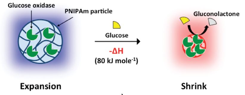 Biomolecule responsive materials have been studied intensively for use in biomedical applications as smart systems because of their unique property of responding to specific biomolecules under mild conditions. However, these materials have some challenging drawbacks that limit further practical application, including their speed of response and mechanical properties, because most are based on hydrogels. Here, we present a fast, mechanically robust biscrolled twist-spun carbon nanotube yarn as a torsional artificial muscle through entrapping an enzyme linked to a thermally sensitive hydrogel, poly(N-isopropylacrylamide), utilizing the exothermic catalytic reaction of the enzyme. The induced rotation reached an equilibrated angle in less than 2 min under mild temperature conditions (25–37 °C) while maintaining the mechanical properties originating from the carbon nanotubes. This biothermal sensing of a torsional artificial muscle offers a versatile platform for the recognition of various types of biomolecules by replacing the enzyme, because an exothermic reaction is a general property accompanying a biochemical transformation.
