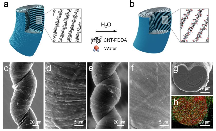 Hygromorph artificial muscles are attractive as self-powered actuators driven by moisture from the ambient environment. Previously reported hygromorph muscles have been largely limited to bending or torsional motions or as tensile actuators with low work and energy densities. Herein, we developed a hybrid yarn artificial muscle with a unique coiled and wrinkled structure, which can be actuated by either changing relative humidity or contact with water. The muscle provides a large tensile stroke (up to 78%) and a high maximum gravimetric work capacity during contraction (2.17 kJ kg−1), which is over 50 times that of the same weight human muscle and 5.5 times higher than for the same weight spider silk, which is the previous record holder for a moisture driven muscle. We demonstrate an automatic ventilation system that is operated by the tensile actuation of the hybrid muscles caused by dew condensing on the hybrid yarn. This self-powered humidity-controlled ventilation system could be adapted to automatically control the desired relative humidity of an enclosed space.