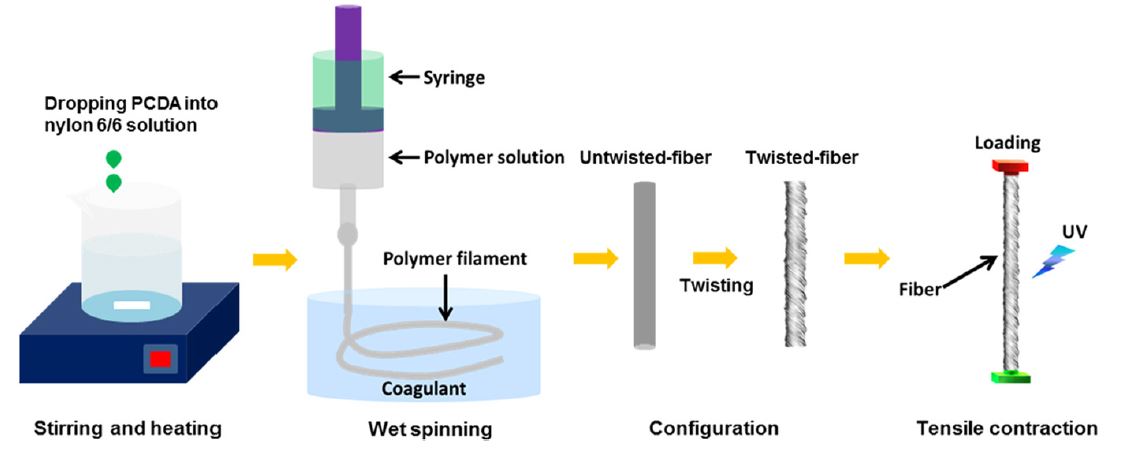 Photomechanically irreversible tensile-actuated diacetylene-embedding nylon 6/6 microfibers were investigated. 10,12-pentacosadiynoic acid (PCDA) monomer, which have conventionally provided a visual color change by temperature and photo-driven stimuli, was embedded in nylon 6/6 microfibers by wet spinning. By ultraviolet (UV) (254 nm) exposure, we observed irreversible tensile actuation (contraction) of linear (untwisted) and helical (twisted) structural microfibers. The tensile contraction of twisted nylon 6/6-PCDA microfiber containing10mM PCDA was reached to ∼2% at 60 °C. Such irreversible tensile contraction can be promoted by volume contraction of PCDA monomers during UV exposure along with irregular structural deformation containing gauche conformation with increasing temperature. The kinetics of tensile contraction with temperature and time were shown by the Arrhenius plots. The activation energies were 34.3–35.7 kJ mol−1 as increasing the concentration of PCDA, implies that the