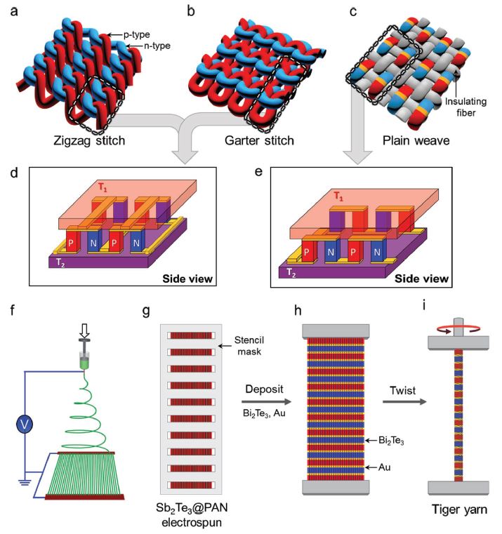 Flexible, lightweight, textile-based thermoelectric (TE) generators are needed for powering electronic devices[1–4] and for harvesting electrical energy from the thermal energy of combustion engines and plant waste streams. Commercial TE devices are rigid, consisting of n- and p-type TEs connected electrically in-series and in-parallel through metallic interconnects. The rigidity of these conventional devices[5,6] limits applications. Flexible TE sheets and nonwoven fabrics based on poly(styrenesulfonate)-doped poly(3,4-ethylenedioxythiophene),[7–9] doped carbon nanotube sheets,[10,11] and graphite composites[12] have been demonstrated in recent pioneering work. However, these sheet-based devices harvest thermal energy in the in-plane direction, rather than in more desirable sheet-thickness direction. TE textiles based on metal wires or metal wire sheaths have been used to harvest thermal energy in the textile thickness directions, but the extremely low figure of merit (ZT) of the metals limited their performance.[13,14] In other work, which resulted in a high ZT for thickness-direction thermal-energy harvesting, Kim et al.[15] screen printed Sb2Te3 and Bi2Te3 pellets on a bendable glass textile and incorporated this structure into flexible rubber sheets. Though a textile was not fabricated, Liang et al.[16] have used a mat of PbTe-coated glass fibers for a single-leg energy harvester that was wrapped on a hot pipe to harvest thermal energy. Additionally, concepts for novel TE textiles that harvest thermal energy in the through-thickness textile direction have been proposed in patents, but neither fabrication methods nor performance results on fabricated textiles were provided.[17,18]