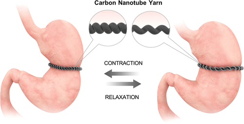 The strong peristaltic contraction of the stomach facilitates mixing and emptying of ingested food, which occurs rhythmically at approximately 3 cycles/min (cpm) in humans. Generally, most patients with gastroparesis show gastric electrical dysrhythmia that is disrupted electrical signals controlling gastric contractions. For treatment of gastric electrical dysrhythmia, in vivo electrical impulses to the stomach via an implanted gastric stimulator have been known to restore these gastric deformations. Nevertheless, improved sensors to monitor gastric contractions are still needed in current gastric stimulators. Recently, we have developed a new technology converting mechanical motion to electrical energy by using stretch-induced capacitance changes of a coiled carbon-nanotube (CNT) yarn. For its potential use as a gastric deformation sensor, the performance of a coiled CNT yarn was evaluated in several biological fluids. For a sinusoidal stretch to 30%, the peak-to-peak open-circuit voltage (OCV) was consistently generated at frequencies below 0.1 Hz. This sinusoidal variation in OCV augmented as the strain increased from 10 to 30%. In an in vitro artificial gastric system, the OCV was approximately linearly proportional to the balloon volume, which can monitor periodic deformations of the balloon at 2, 3, and 4 cpm as shown for human gastric deformations. Moreover, stretchy coiled yarns generate the peak electrical voltage and power when deformed. The present study shows that a self-powered CNT yarn sensor can not only monitor the changes in frequency and amplitude of volumetric change but also generate electrical power by periodic deformations of the balloon. Therefore, it seems possible to automatically deliver accurate electrical impulses according to real-time evaluation of a patient’s gastric deformation based on information on the frequency, amplitude, and rate of the OCV from CNT yarn.