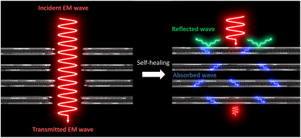 The electromagnetic pollution issues have been arising from the fast-growing development for electronic devices. Hence, the demand for materials with high electromagnetic interference (EMI) shielding performance has increased. Here, we developed self-healable, flexible and printable graphene oxide/silver nanowire films and textiles with excellent EMI shielding performance. The maximum electromagnetic interference shielding effectiveness (EMI SE) of 92 dB was recorded for an 18 μm-thickness film. In addition, the specific EMI shielding effectiveness was 31 dB cm3/g or 48,275 dB cm2/g when normalized to film thickness. Both values are higher than reported EMI shielding products. The composite film and coated textile were tolerant of damage induced by cracking or scratching. Damaging the films by cracking reduced the electrical conductivity, mechanical properties, and the EMI SE was decreased from 72 dB to 56 dB at 8.2 GHz. After the healing process, the EMI SE was recovered to 71 dB and mechanical properties restored. The EMI SE of textile reached a maximum of 30 dB which is suitable to use as a commercial EMI shielding product. In addition, the textile exhibited high flexibility, and showed excellent mechanical stability with no change in performance after 1000 bending cycles.