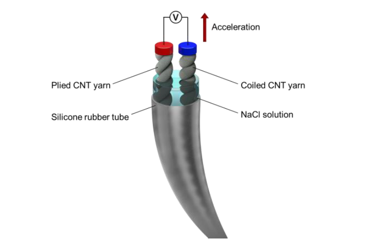 Accelerometers are indispensable for detecting accelerating forces in automotive electronic systems. Although several accelerometers have been developed, they are still unstable for vehicle dynamics applications in the low frequency range (0-20 Hz). Here, we report a novel type of accelerometer based on a coiled carbon nanotube (CNT) yarn as a self-powered and low frequency range-covered acceleration sensor. The proposed sensor is designed in a compact fiber-like structure for practical applications. Open circuit voltage (OCV) signals are consistently generated during the stretch-and-release process of the coiled CNT yarn by the applied sinusoidal accelerations, and the OCV changes increase linearly with increasing acceleration from 4.84 to 48.37 m/s2. Our accelerometer exhibits excellent dynamic sensing performance in the low frequency range compared with commercial accelerometers. In an application as a CNT yarn device configured with a mass load, the OCV change is linearly proportional to the applied acceleration. When our accelerometer is attached to a seatbelt in a vehicle, it generates OCV changes from the movement of the body mass underlying a certain acceleration change. Given its excellent sensing performance, the CNT yarn acceleration sensor could be further developed for practical applications such as seatbelts and car seats with fabric and textile.