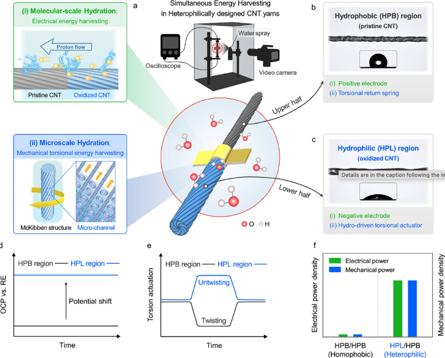 Water holds vast potential for a useful energy source, yet traditional approaches capture only a fraction of it. This study introduces a heterophilically designed carbon nanotube (CNT) yarn with an asymmetric configuration. This yarn is capable of both electrical and mechanical torsional energy harvesting through dual-scale hydration. Fabricated via half-electrochemical oxidation, the yarn contains a hydrophilic region enriched with oxygen-containing functional groups and a hydrophobic pristine CNT region. Molecular-scale hydration triggers proton release in the hydrophilic region. Consequently, a concentration gradient is established that generates a peak open-circuit voltage of 106.0 mV and a short-circuit current of 20.6 mA cm−2. Simultaneously, microscale hydration induces water absorption into inter-bundle microchannels, resulting in considerable yarn volume expansion. This process leads to hydro-driven actuation with a torsional stroke of 78.8° mm−1 and a maximum rotational speed of 1012 RPM. The presented simultaneous harvesting results in electrical and mechanical power densities of 3.5 mW m−2 and 34.3 W kg−1, respectively, during a hydration cycle. By integrating molecular and microscale hydrations, the proposed heterophilic CNT yarns establish an unprecedented platform for simultaneous electrical and mechanical energy harvesting from water, representing a groundbreaking development for sustainable applications.