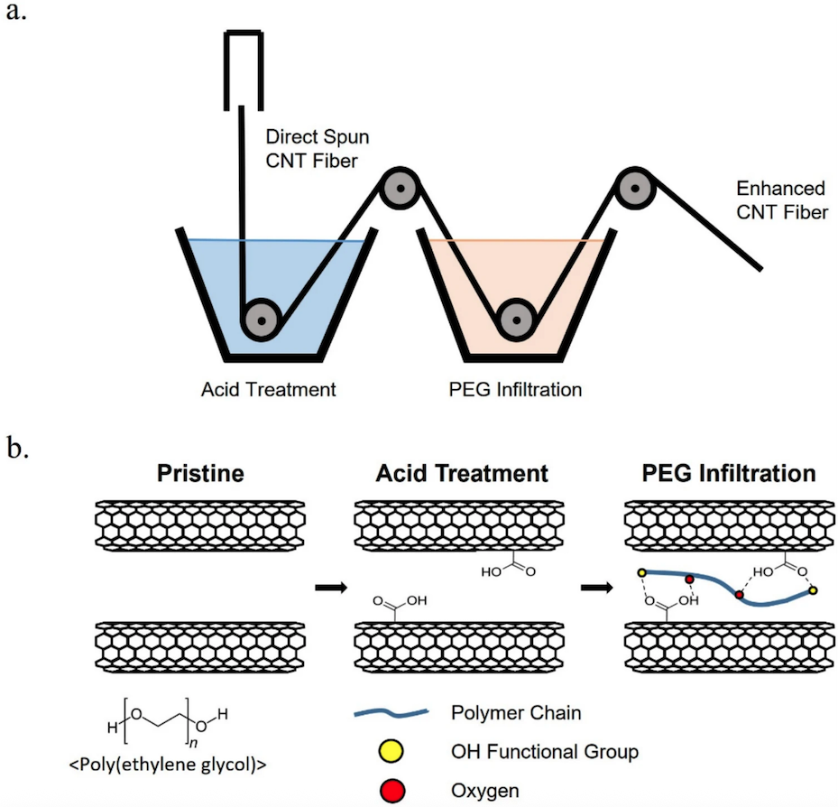 Carbon nanotube (CNT) fiber is a promising material for various applications, such as wearable devices, energy harvesting, energy storage, and artificial muscles. The floating catalyst chemical vapor deposition (FCCVD) method allows mass production of CNT fibers. However, the mechanical and electrical properties of the CNTs fabricated using the FCCVD method are inferior to those of the CNT fibers fabricated using other methods, such as wet spinning and spinnable CNT forests. Therefore, suitable methods are required to improve the mechanical properties and electrical conductivity of CNT fibers obtained using the FCCVD method. One strategy is infiltration of a polymer into the CNT fiber. In this study, polyethylene glycol was infiltrated into pristine CNT fibers and formed hydrogen bonds with the oxygen present on surface of CNTs from FCCVD method. Solvent evaporation resulted in the formation of dense CNT fibers, which featured more connections among the CNTs. The polymer-incorporated CNT fiber exhibited high toughness, ultimate strength, and electrical conductivity and can thus be employed in various real-life applications.