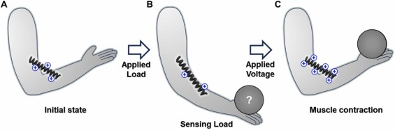 Carbon nanotube (CNT) artificial muscles driven by an electrochemical double layerdemonstrate high performance owing to their coiled structure, which is formed by inserting a high twist density into CNT yarns. Although these coiled structures enable large strokes by twist transference from the yarn to the coil, they are susceptible to external loads, which deform their structure and affect their performance. Hence, the ability to sense external loads is essential for their optimal functionality. Artificial muscles with integrated perception and actuation enable efficient operation based on sensing. Herein, we demonstrate coiled CNT artificial muscles with integrated perception and actuation that exhibit varying electrochemical capacitance with external load. Higher external loads increase the yarn density, thereby decreasing their electrochemical surface area, and the elongated muscle is restored in response to external load changes by regulating the input voltage through electrochemical capacitive sensing.