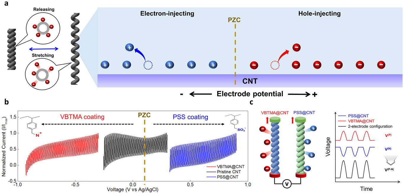 Asymmetric Mechano-Electrochemical Energy Harvesting System with Surface Charge–Modified Carbon Nanotube Yarn for Wearable Devices