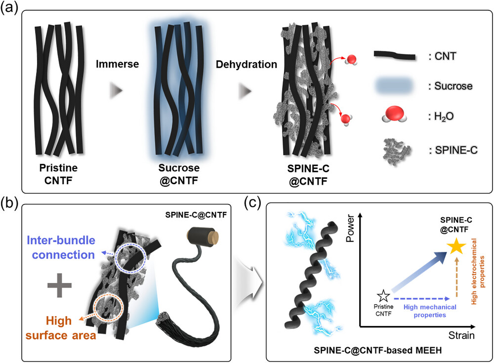 Enhancing both mechanical and electrochemical properties of direct-spun carbon nanotube fiber (CNTF) is essential for energy harvesting applications, but conventional strategies often improve one at the expense of the other. Herein, a sucrose-derived porous carbon network is internally formed within the inter-bundle voids of direct-spun CNTFs, simultaneously enhancing their mechanical and electrochemical properties. This sucrose-derived porous internally embedded carbon (SPINE-C) reinforced inter-bundle connectivity while preserving the alignment of CNTs, thereby enhancing the tensile strength (235–350 MPa), torsional durability (177.5–294.4 mN·m·mm−3), and toughness (5–20 J g−1) of the CNTFs without compromising their flexibility. Additionally, the microporous structure of SPINE-C expanded the electrochemically accessible surface area, improving in charge storage capacity from 7.2 to 8.0 F g−1. These enhancements in mechanical and electrochemical properties translated into superior energy harvesting performance in SPINE-C-based mechano-electrochemical energy harvester (MEEH), with the power density increasing from 16.2 to 46.0 W kg−1 at 1 Hz—a 2.8-fold enhancement. These results highlight the potential of the SPINE-C strategy as a scalable and high-performance electrode platform for fiber-based energy harvesters, wearable electronics, and smart textiles.