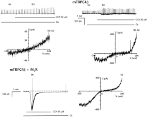 The classical type of transient receptor potential (TRPC) channel is a molecular candidate for Ca(2+)-permeable cation channels in mammalian cells. Because TRPC4 and TRPC5 belong to the same subfamily of TRPC, they have been assumed to have the same physiological properties. However, we found that TRPC4 had its own functional characteristics different from those of TRPC5. TRPC4 channels had no constitutive activity and were activated by muscarinic stimulation only when a muscarinic receptor was co-expressed with TRPC4 in human embryonic kidney (HEK) cells. Endogenous muscarinic receptor appeared not to interact with TRPC4. TPRC4 activation by GTPgammaS was not desensitized. TPRC4 activation by GTPgammaS was not inhibited by either Rho kinase inhibitor or MLCK inhibitor. TRPC4 was sensitive to external pH with pK (a) of 7.3. Finally, TPRC4 activation by GTPgammaS was inhibited by the calmodulin inhibitor W-7. We conclude that TRPC4 and TRPC5 have different properties and their own physiological roles.