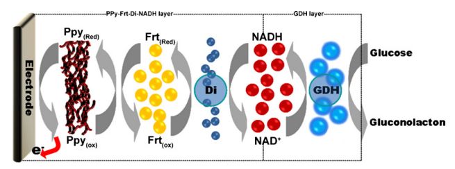 An enzyme anode for use in biofuel cells (BFCs) was constructed using an electrically connected bilayer based on a glassy carbon (GC) electrode immobilized with the conducting polymer polypyrrole (Ppy) as electron transfer enhancer, and with horse spleen ferritin protein (Frt) as electron transfer mediator. The surface-coupled redox system of nicotinamide adenine dinucleotide (NADH) catalyzed with diaphorase (Di) was used for the regeneration of NAD+ in the inner layer and the NAD+-dependent enzyme catalyst glucose dehydrogenase (GDH) in the outer layer. The outer layer of the GC–Ppy–Frt–Di–NADH–GDH electrode effectively catalyzes the oxidation of glucose biofuel continuously; using the NAD+ generated at the inner layer of the Di-catalyzed NADH redox system mediated by Frt and Ppy provides electrical communication with enhancement in electron transport. The electrochemical characteristics of the electrodes were investigated by cyclic voltammetry (CV) and linear sweep voltammetry (LSV). This anode provides a current density of 1.2 mA cm−2 in a 45 mM glucose solution and offers a good possibility for application in biofuel cells.