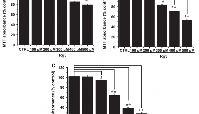 Ginsenosides play a role in a number of physiological and pharmacological functions in the gastrointestinal tract. The aim of this study was to clarify the potential role for transient receptor potential melastatin 7 (TRPM7) channels in ginsenoside Rg3-inhibited growth and survival of AGS cells, the most common human gastric adenocarcinoma cell line. The AGS cells were treated with varying concentrations of Rg3. Sub-G1 analysis, caspase-3 activity and poly(ADP-ribose) polymerase (PARP) cleavage analysis were conducted to determine whether AGS cell death occurs by apoptosis. TRPM7 channel blockers (La3+ or 2-APB) and small interfering RNA (siRNA) were used in this study to confirm the role of TRPM7 channels. Furthermore, TRPM7 channels were over-expressed in human embryonic kidney (HEK) 293 cells to identify the role of TRPM7 channels in AGS cell growth and survival. The addition of Rg3 to the culture medium inhibited AGS growth and survival. Experimental results showed sub-G1 was markedly increased, caspase-3 activity was elevated, and degree of PARP cleavage was increased. TRPM7 channel blockade, either by La3+ or 2-APB or by suppressing TRPM7 expression with siRNA, blocked the Rg3-induced inhibition of cell growth and survival. Furthermore, TRPM7 channel over-expression in HEK 293 cells exacerbated Rg3-induced cell death. These findings indicate that ginsenoside Rg3 inhibits the growth and survival of gastric cancer cell which is because of the blockade of TRPM7 channel activity. Therefore, TRPM7 channels may play an important role in the survival of gastric cancer.