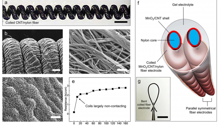 2.6 mWh/cm2 and 66.9 mW/cm2, respectively), despite the engineered superelasticity of the fiber supercapacitor. Retention of supercapacitor performance during large strain (50%) elastic deformation is demonstrated for supercapacitors incorporated into the wristband of a glove.